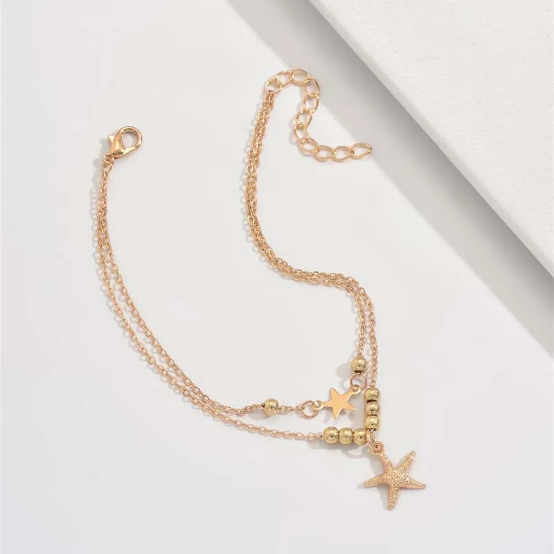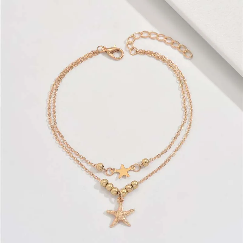 Layered Bohemian Summer Beach Anklet For Women Vintage Gold Color Star Starfish Pendant Bracelet Chain On Leg Jewelry